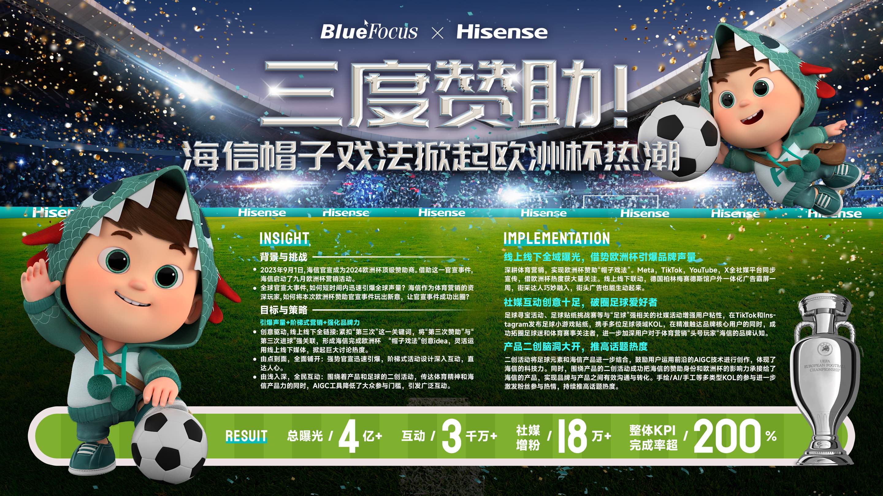 2023年9月1日,海信官宣成为2024欧洲杯顶级赞助商。借助这一官宣事件,海信启动了九月欧洲杯营销活动。我们将海信的“第三次赞助”和足球中代表“第三次进球”的术语“帽子戏法”结合,得到“Hisense Scores a Hat Trick”的主题。执行过程中以社媒运营为核心,搭配创意贴纸,红人,线下大屏等综合营销板块。丰富的活动内容设计把海信的赞助身份和欧洲杯的影响力承接给了海信的产品,实现品牌与产品之间有效沟通与转化。项目整体曝光超4亿,KPI完成率 275%;互动超3千万,KPI完成率 282%;增粉18万+,KPI完成率超100%。
