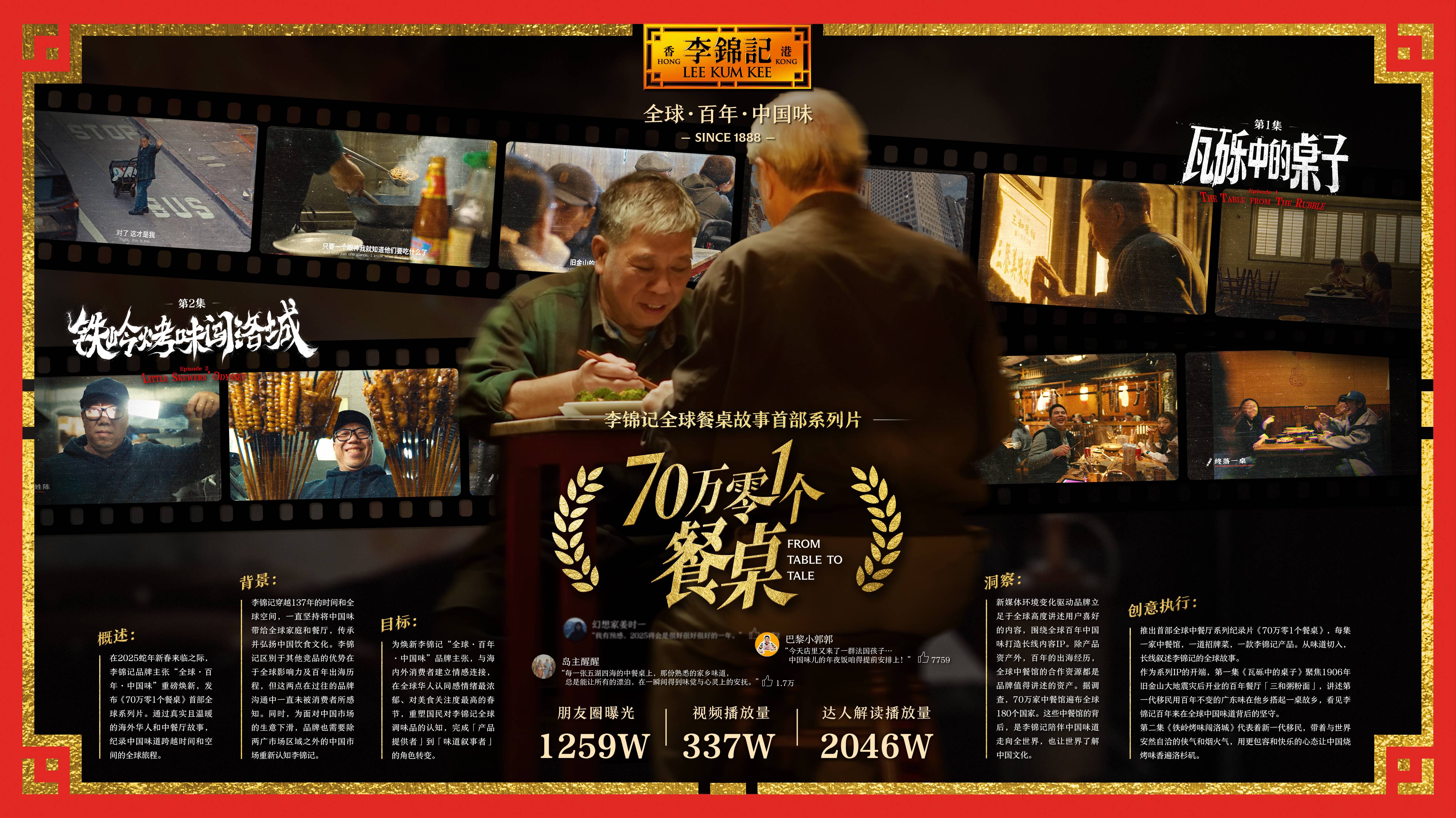 在2025蛇年新春来临之际,李锦记品牌主张“全球·百年·中国味”重磅焕新,发布《70万零1个餐桌》首部全球系列片。通过真实且温暖的海外华人和中餐厅故事,纪录中国味道跨越时间和空间的全球旅程。 一瓶酱料的旅程,不只是厨房的味道,更是勾起一代人乡愁的“时间胶囊”,也是漂洋过海之后,华人游子心中那份“家的味道“。每集一家中餐馆,一道招牌菜,一款李锦记产品。从味道切入,用一顿饭的时间,讲述中国味道背后的真实人物。让世界听见我们的故事,看见属于中国的美食文化。