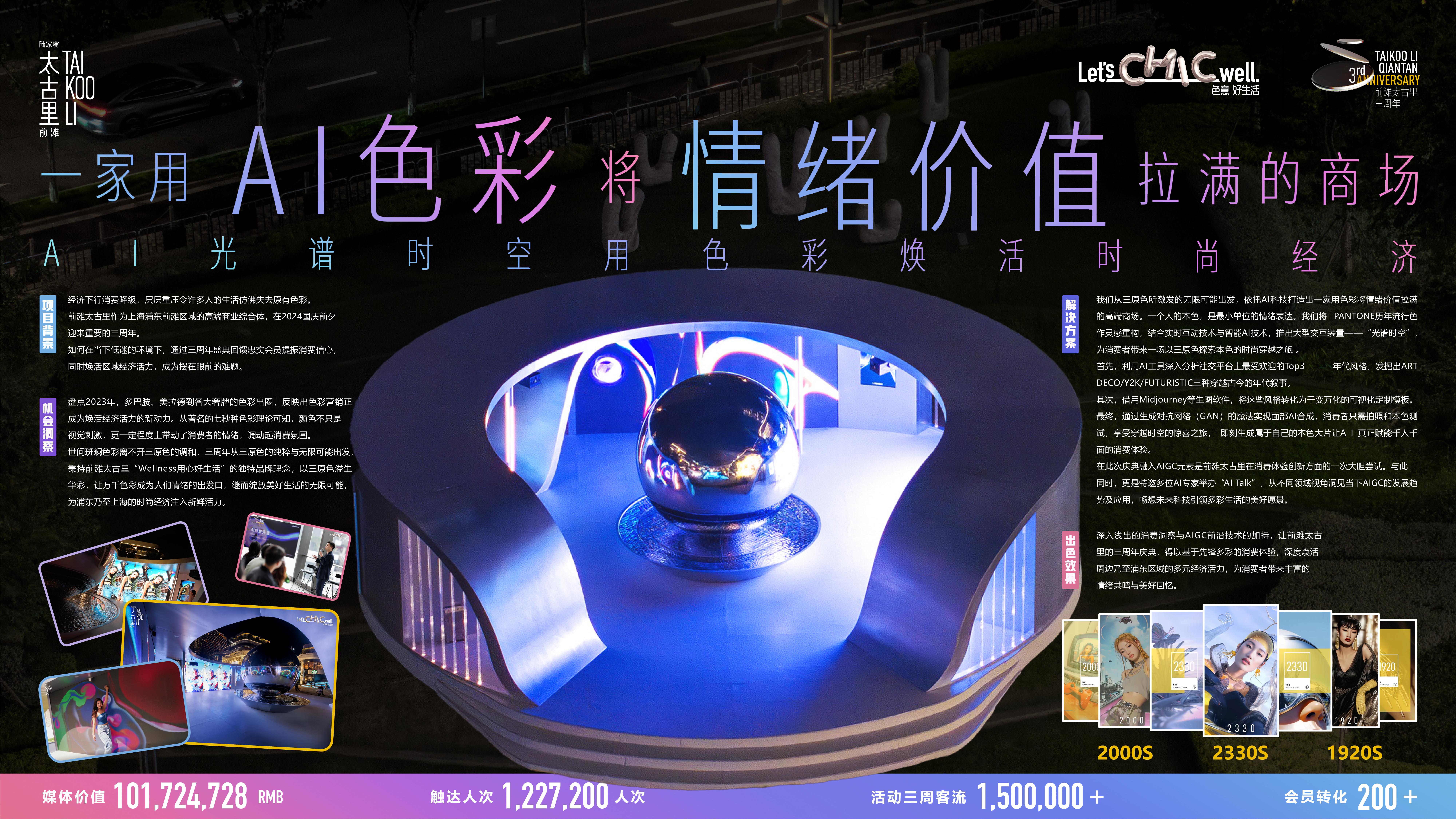2024年在消费降级的大环境下,前滩太古里以三周年为契机,以三原色为灵感,将色彩升维为“情绪货币”撬动商业增长。活动结合AI、实时交互与生成对抗网络(GAN)技术,打造“光谱时空”交互装置:消费者通过本色测试与AI面部合成生成专属色彩大片,并联动CRM系统推荐相应色彩的逛游路线,实现“千人千色”的个性化消费体验。三周内触达120万人次,吸引150万客流,创造超1亿媒体价值,成功探索出“RGB撬动GDP”的色彩经济商业路径,为高端商场破局同质化竞争提供前瞻范式。
