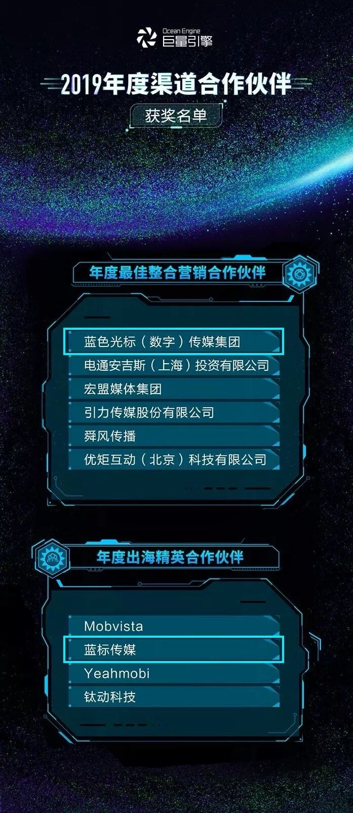 1月8日晚间,巨量引擎公布2019年优秀渠道合作伙伴名单。蓝标传媒凭借强劲的营销实力和近年的亮眼表现,一举斩获“巨量引擎2019年度最佳整合营销合作伙伴”和“巨量引擎2019年度出海精英合作伙伴”两项重量级大奖,打响2020年捷报的第一炮!