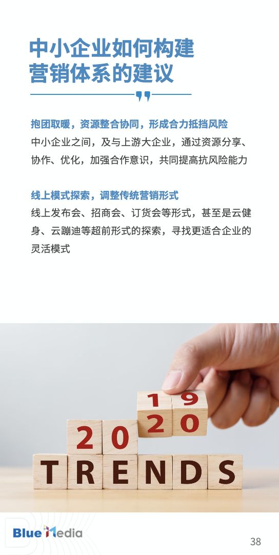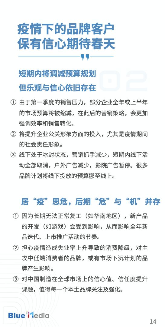 通过与国内外客户和媒体的深度探讨,蓝标传媒基于从事数字营销行业多年积淀的经验与资源,发布报告《蓝标观察:新型冠状病毒影响之下的营销趋势预判与洞察》,梳理特殊时期的营销趋势和建议,助力企业高效营销。